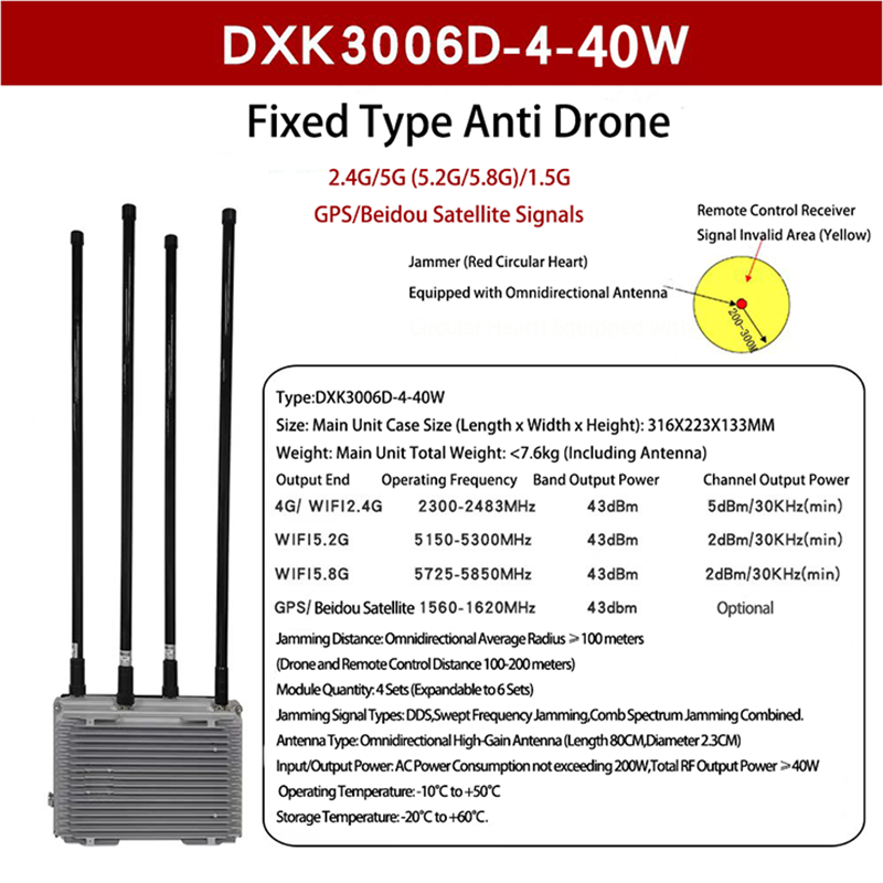 Цей стаціонарний антидронний глушник ефективно блокує керуючі сигнали невеликих повільних дронів, що літають на низьких висотах, таких як бездротові дрони з дистанційним керуванням та апарати, обладнані GPS і системою навігації Beidou. Під впливом глушника дрони втрачають керування і повертаються у початкову точку або здійснюють посадку.